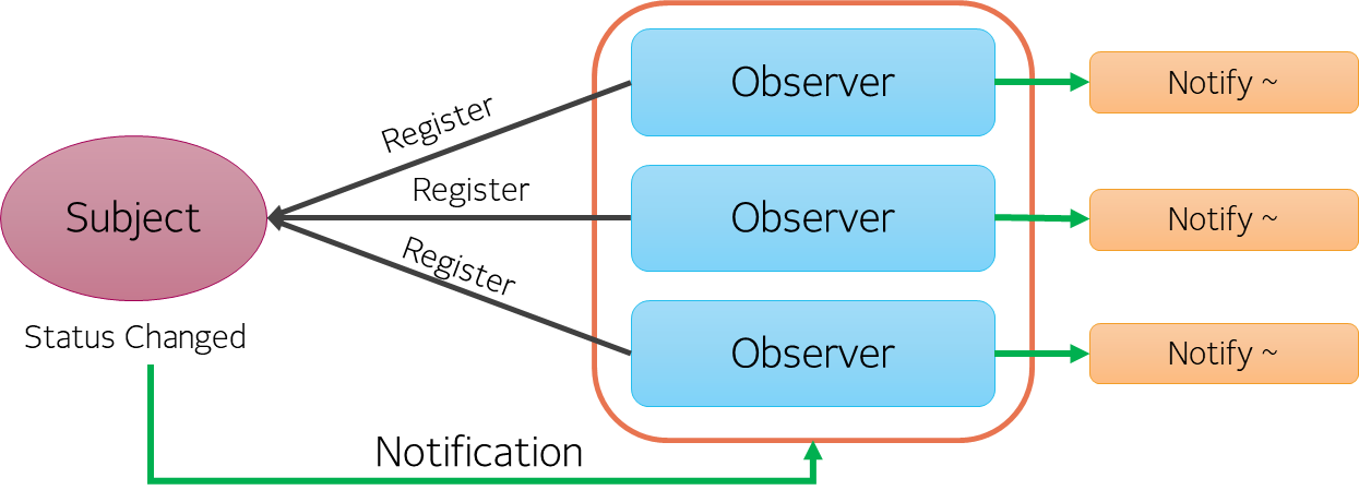 Subject의 상태를 관찰할 Observer들을 등록(추가)하고, Subject의 상태가 변경될 때, 등록된 모든 Observer에게 통지를 해주어 Notify 함수를 호출하도록 한다.