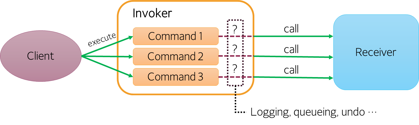 Client에서 Receiver로 명령을 직접 전달하지 않고 Invoker를 거치게 함으로써 Invoker에서 명령을 기록, 큐잉 등의 여러가지 설계를 가능하도록하는 것이 커맨드 패턴의 핵심이다. 또한 모든 명령을 단순히 메서드화가 아닌 캡슐화를 통해 클래스를 만드는 것 또한 필요하다.