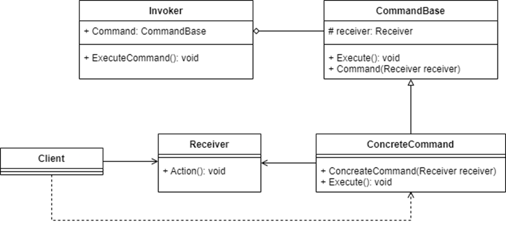 | Client | 명령 개체를 생성하고 수신기를 가지고 있으며 명령을 Invoker와 연결하고 명령 실행을 트리거 |