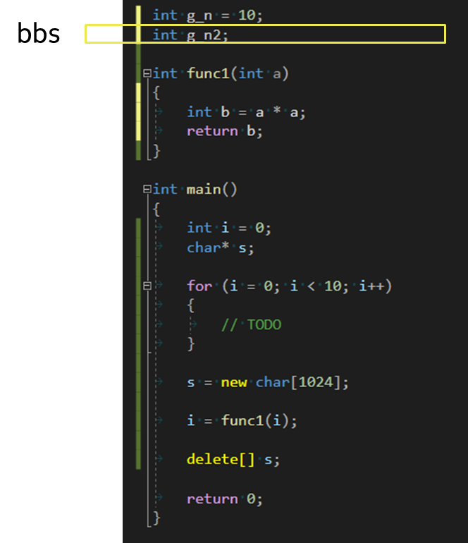 위 코드에서 g_n2가 선언되었지만 초기화 되지 않았으므로 bss 영역에 저장된다.