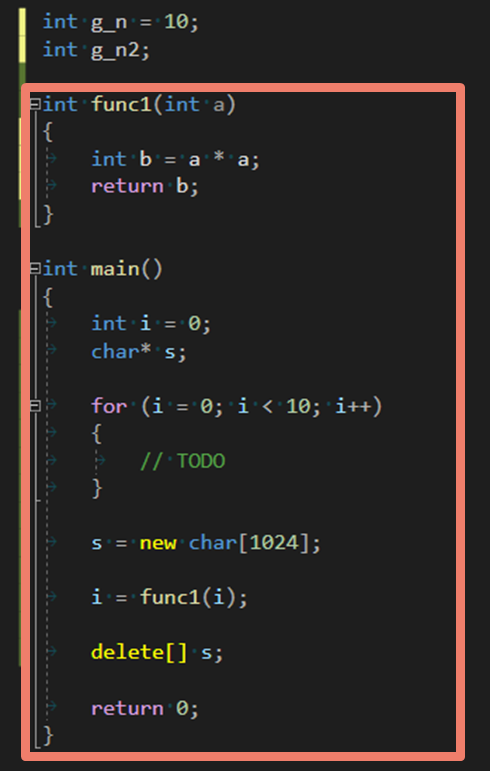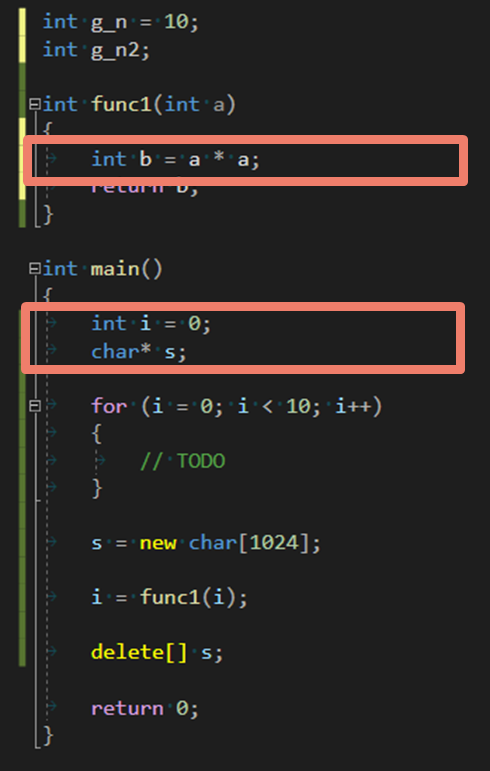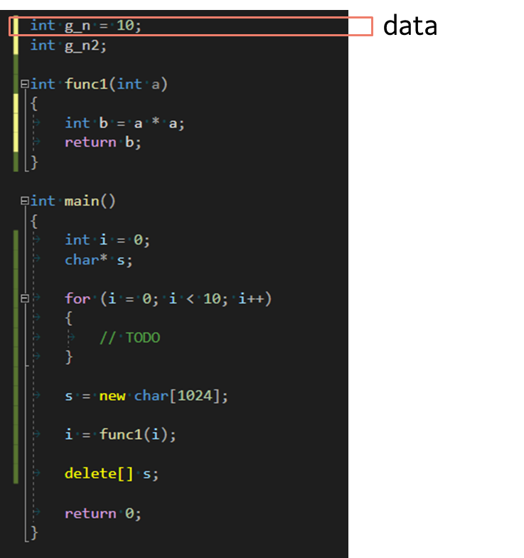 g_n 이라는 이름의 int 타입 변수가 10으로 초기화 되면서 전역 변수로 선언되어 있다. 이 값은 data 영역에 저장된다.