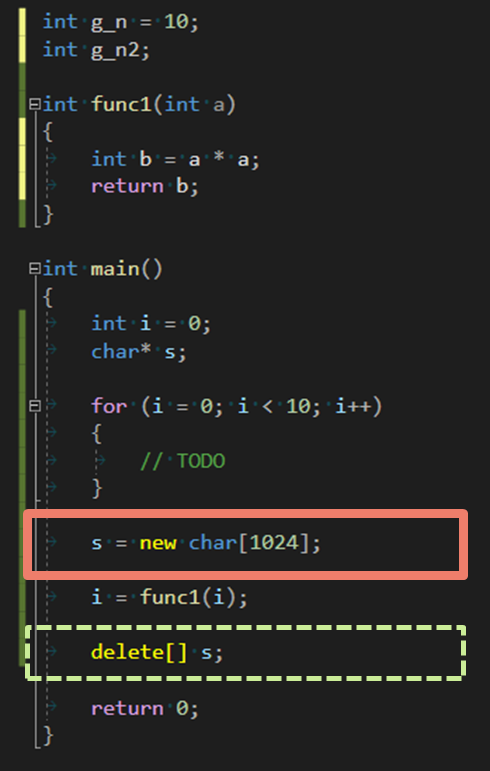 new 키워드를 통해 명시적으로 공간을 할당해주고 delete로 할당된 공간을 해제한다. 할당된 데이터는 heap 영역에 저장된다.