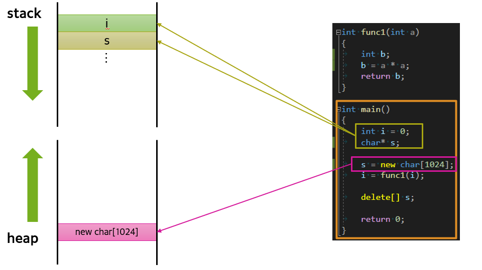 지역변수는 스택에, new를 통해 동적할당 된 값은 heap에 들어가게 된다.