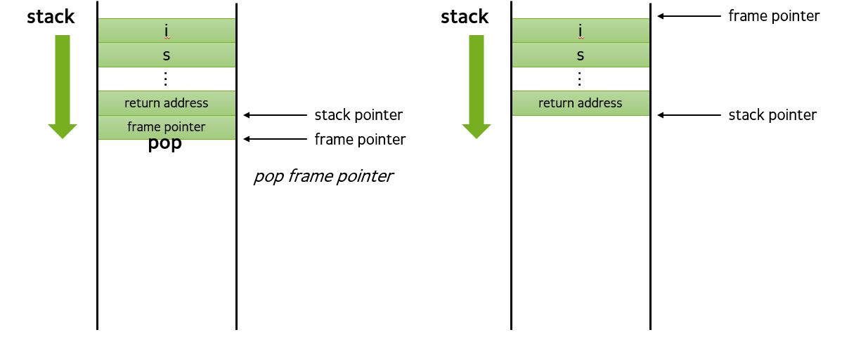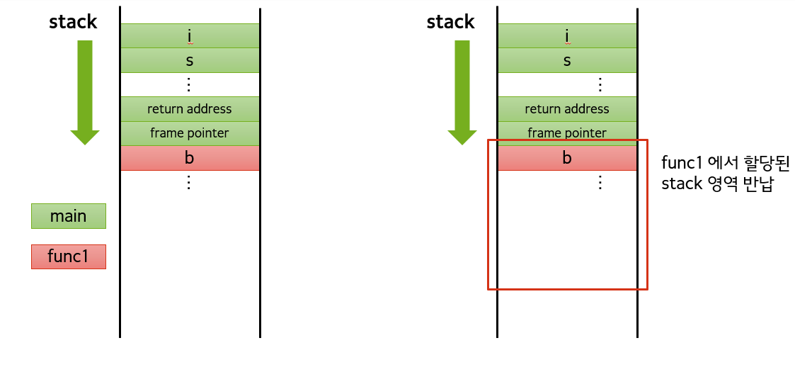 func1 함수가 return 되어 종료되었을 때, func1에 사용되었던 지역변수 및 인자등을 가지고 있던 스택영역이 해제되면서 반납되게 된다. (이전 frame pointer가 기준)