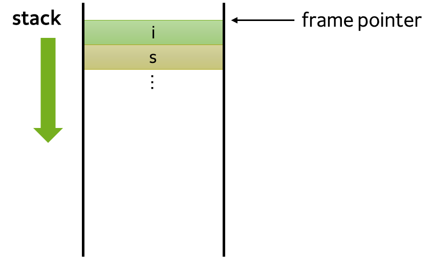 main 함수의 지역 변수 i와 s가 스택에 들어가게 된다.