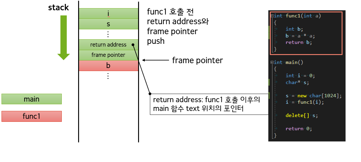 func1를 호출하게 되면 먼저 main 함수의 return address와 frame를 순서대로 스택에 push한다.