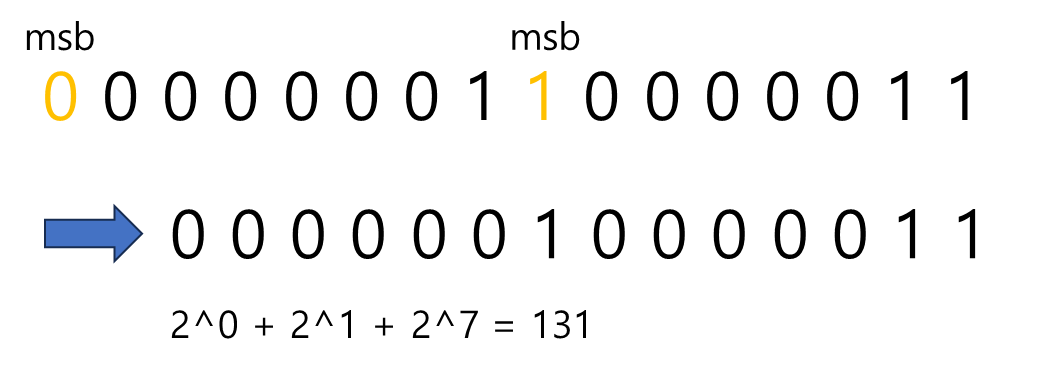 131은 1바이트 내에 표현할 수 없으므로 2바이트로 표현한다.