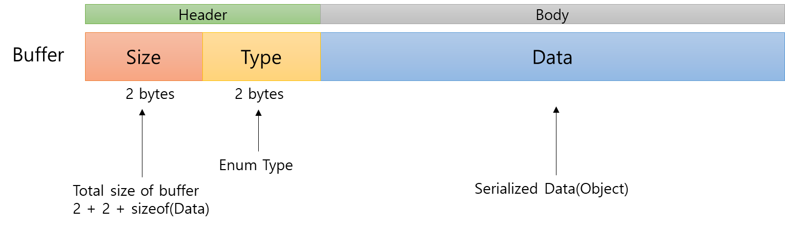CustomBuffer (직접 직렬화한 버퍼)를 사용하였을 때는 버퍼의 헤더를 추가하여, 버퍼의 맨앞에 2바이트 타입을 추가하고 그 값으로 전체 패킷의 길이를 넣었고 두번째 2바이트 값으로 해당 패킷의 원래 객체 타입을 정의해서 넣었었다.