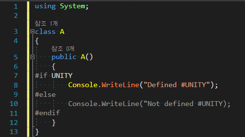 #define UNITY를 하지 않았지만 프로젝트 설정의 조건부 컴파일 심볼 옵션에 UNITY를 추가해 주었기 때문에 코드가 활성화 되었다.