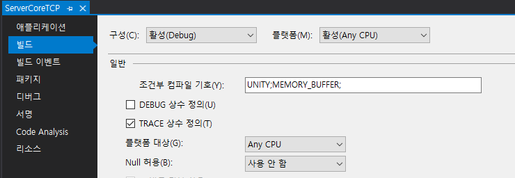 구성에 따라 (Debug, Release모드 등에 따라) 조건부 컴파일 기호는 각각 다르게 입력할 수 있다.