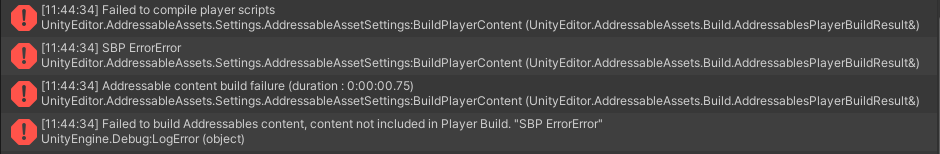 For a while now, when I try to build Addressables it give me both "Failed to compile player scripts" and "SBP Error" and not build them. They work fine...