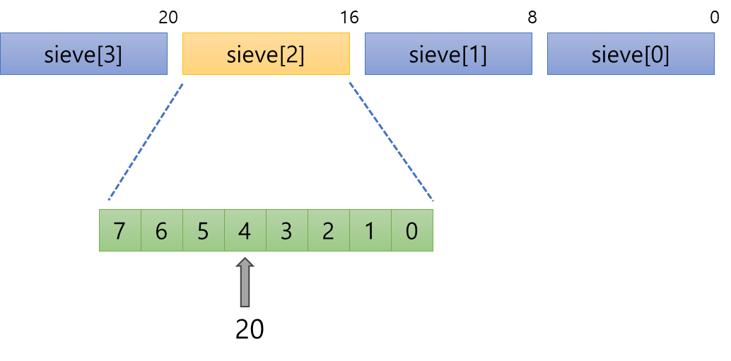 k / 8 = 2 => sieve[2]에 k=20이 소수인지에 대한 비트가 있다.