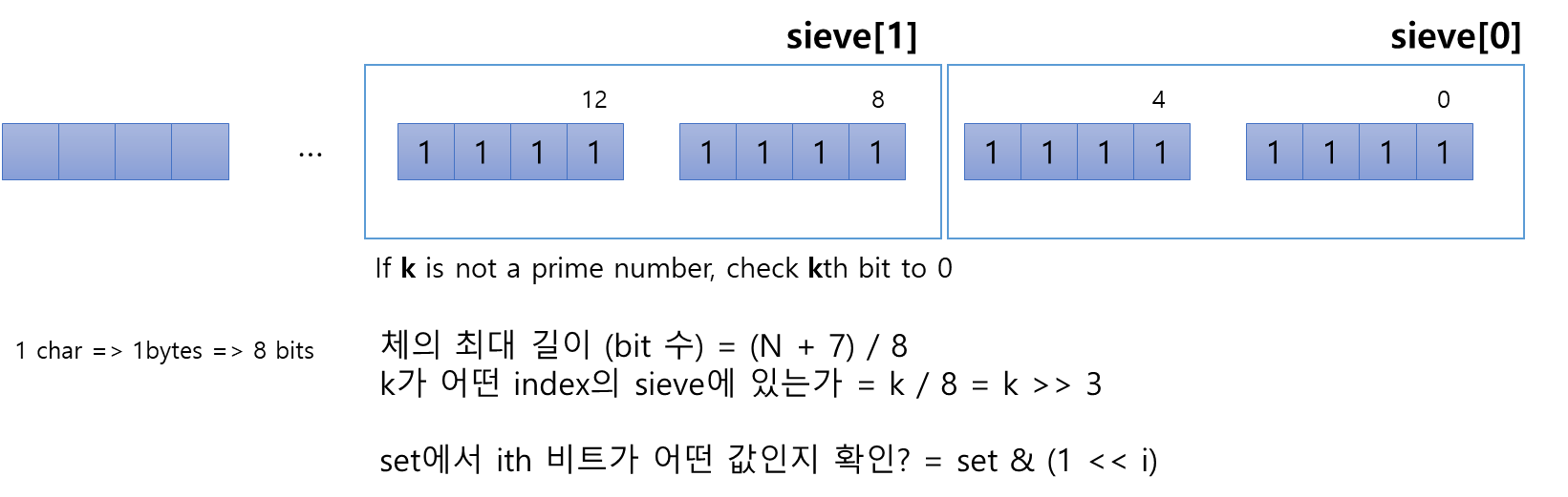 - sieve에서 k를 0으로 표시하기: sieve[k/8] & ~(1<<(k%8))