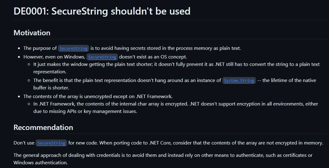 SecureString을 이용해 암호화/복호화 시에만 잠깐 메모리에서 사용하고 사용이 끝나면 즉시 메모리에서 제거하는 방법이다. 메모리에 저장하는 문자열 자체(char 집합체...)가 암호화 되어있긴 하다. (결국 이 것도 완벽한 보안을 제공하지는 않는다. 심지어 새 코드에서는 사용하지 않는 것을 추천한다고 나와있기도 하다.)