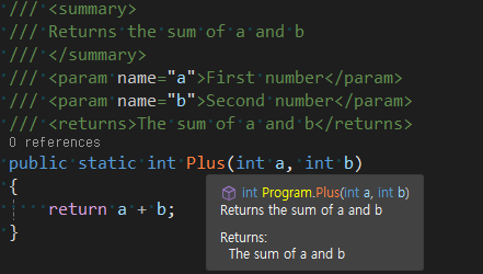 클래스나, 프로퍼티(속성), 변수, 메서드의 선언 위에서 `/// (/ 3번)`을 입력하면 자동으로 포맷이 생성된다.