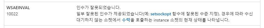 ::WSAGetLastError()로 얻은값이 10022 (WSAEINVAL)값으로 에러가 발생했다.
