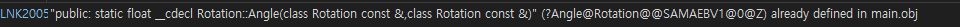 위 에러는 Transform.obj에서 나타났는데, main.obj에 이미 컴파일 된 Angle 함수가 정의되어 있기 때문이다. Transform.obj에서 Angle이라는 메서드를 만들었는데, main.obj에서 다시 만들려고 해서 나타난 에러이다.