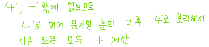 | answer // 최종 출력할 값 minusTokens // 문자열을 '-'로 나눈 토큰들 while (hasMoreMinusTokens) { plusTokens = minusToken을 '+'로 나눈 결과 토큰들 while (hasMorePlusTokens) { number = plusToken } // 처음 수 (A 인지 확인)이면 + 계산 if 처음 수 : answer += number // 2번째 부터는 B 이므로 '-' 계산 else : answer -= number } |