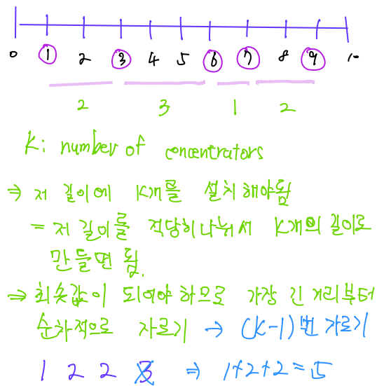 | 첫째 줄에 문제에서 설명한 최대 K개의 집중국의 수신 가능 영역의 길이의 합의 최솟값을 출력한다. |