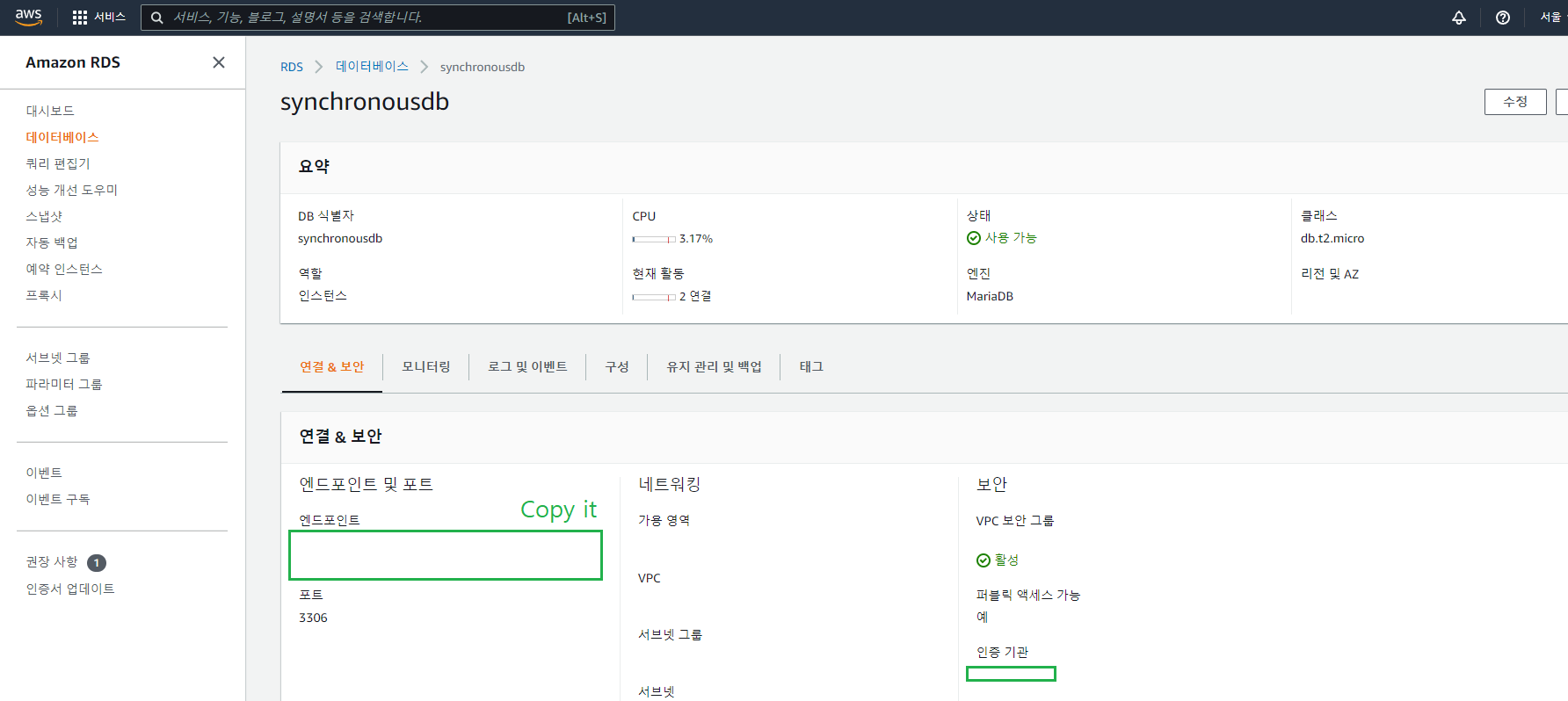 엔드 포인트는 RDS의 데이터베이스 인스턴스 정보에서 확인 할 수 있다.