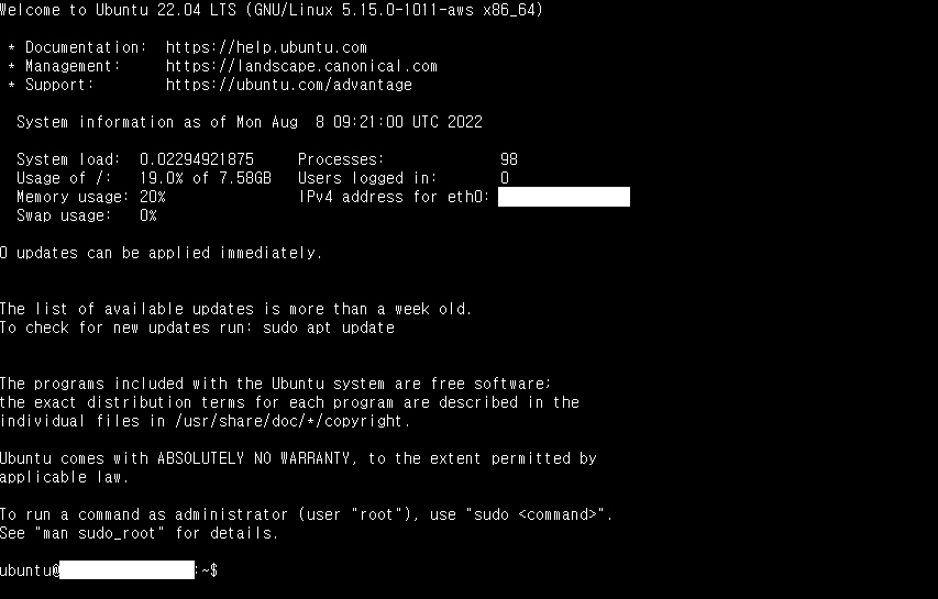 이제 AWS의 우분투 시스템을 이용할 수 있다.