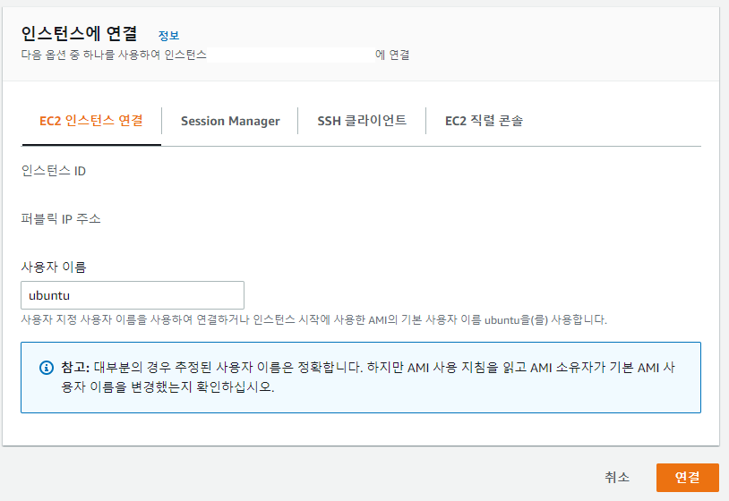 - 인스턴스 선택 후 연결 클릭
