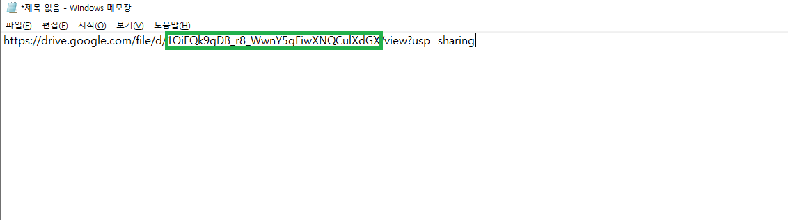 3. 링크 복사를 눌러 링크를 복사해 두고 메모장 등의 문서에 잠깐 붙여넣은 후, 공유 파일의 id 부분만 남겨둔다.