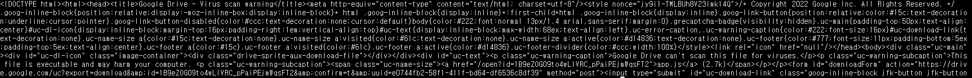 예를 들어, app.js 파일을 직접 구글 드라이브에서 다운로드 했을 경우, 다운로드는 되지만 다운로드한 파일을 열어서 확인할 경우 아래와 같다.