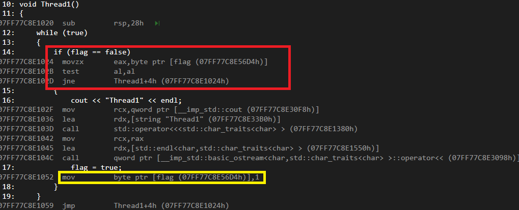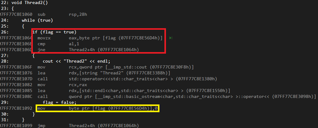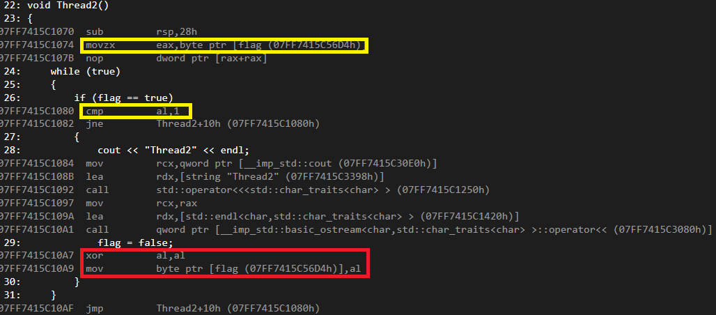만약, movzx가 Thread1이 flag 값을 1(true)로 바꾼 후에,Thread2가 시작이 되어서 Thread2의 al에 있는 값이 true로 시작하게 된다면 Thread2가 출력 될 것이다.
