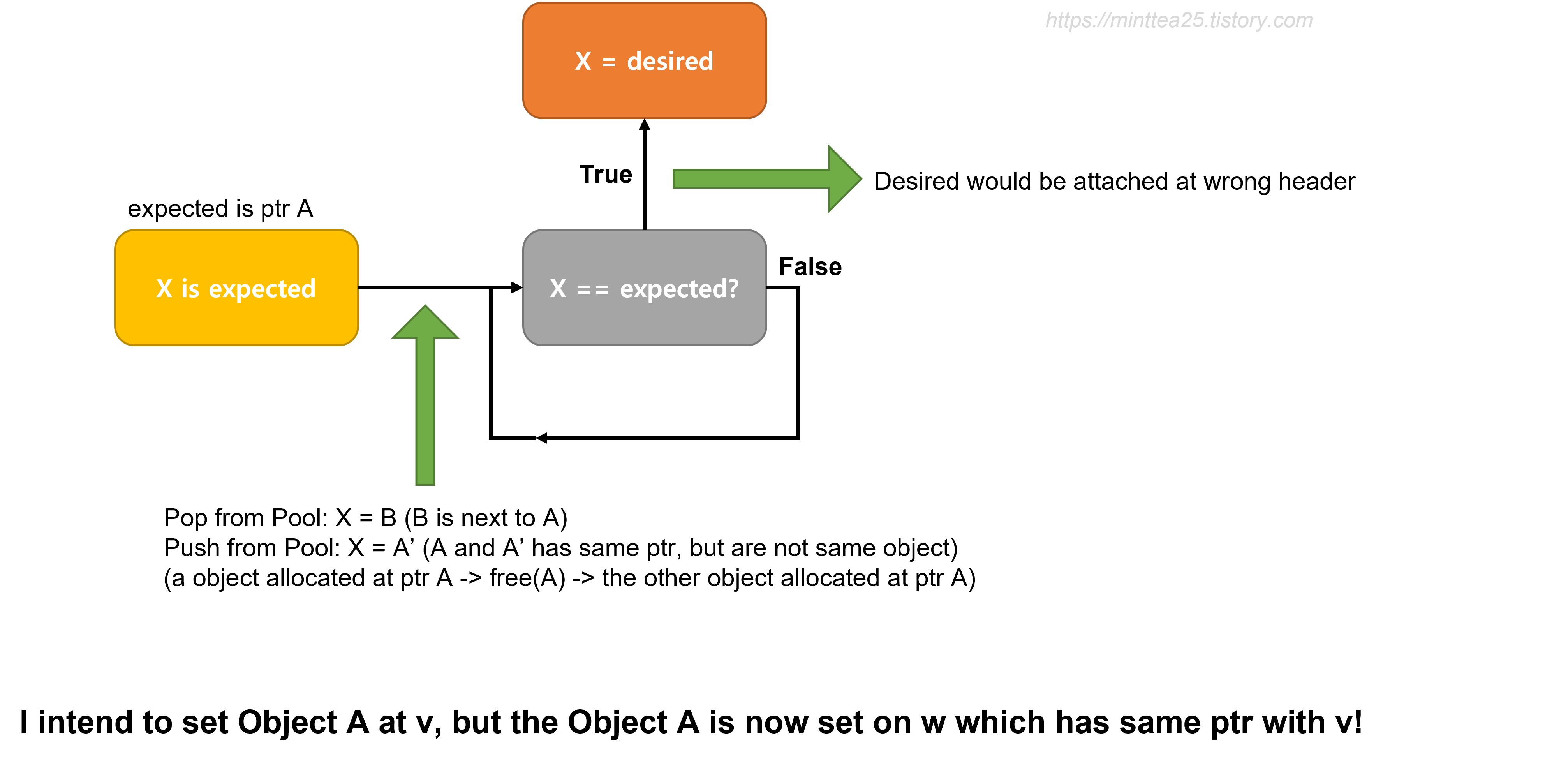 (Compare and swap 에서 현재 X라는 값이 A이고 무한 루프를 돌면서 X가 여전히 A일 때 X에 B를 넣게 되는 구조이다. 여기서 X 값에 대해 다른쓰레드에서 B를 넣어주었다가 다시 A를 넣을 수 있는 상황이 생긴다. 그러나 나중에 넣어진 A는 기존에 있던 A가 아니다. 즉, 같은 포인터를 가지고 있지만 같은 노드(공간)이 아니라는 것이다.