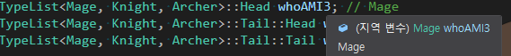 TypeList<Mage, Knight, Archer>::Tail::Head whoAMI1; // Knight