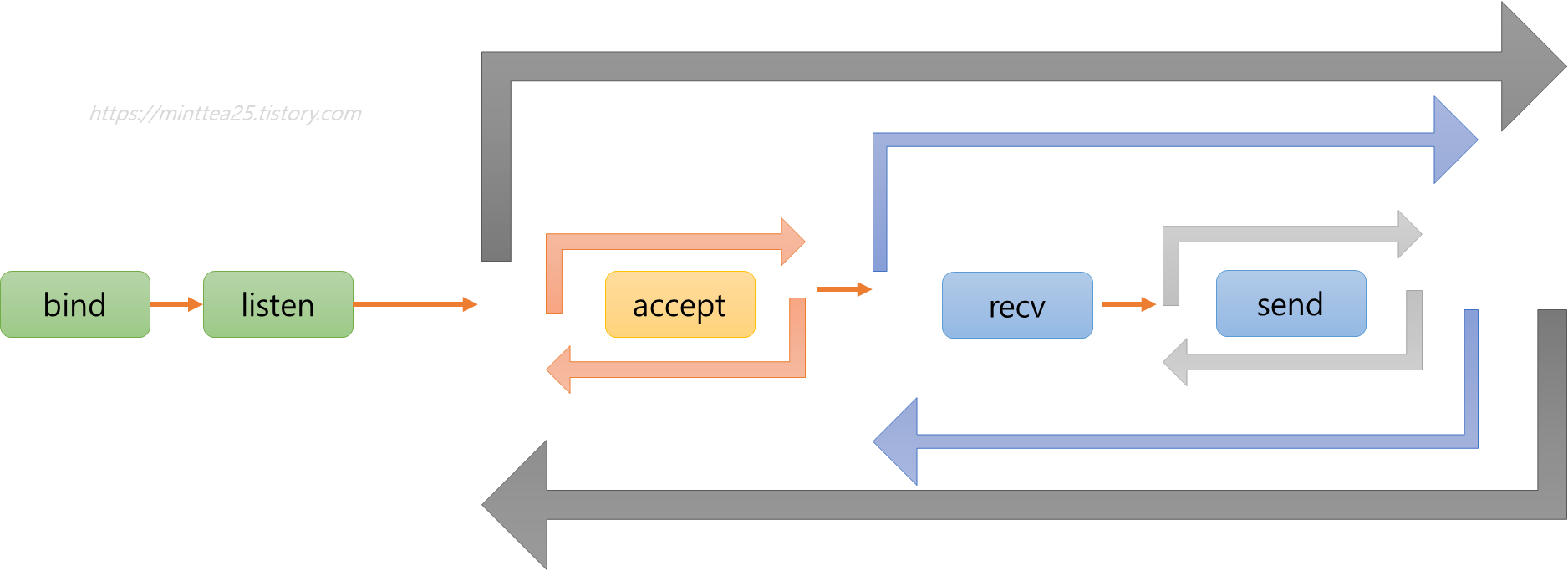 bind - listen - accept 확인 - recv 대기 - send 실행 확인 - 반복