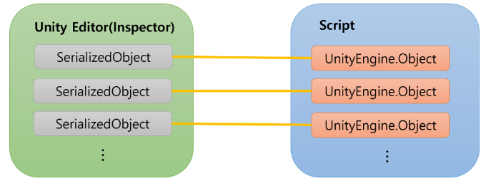 간단히 말해서 UnityEngine.Object는 코드 상에서 존재는 실제 인스턴스를 가지고 있는 객체이고 SerializedObject는 UnityEngine.Object가 가지고 있는 인스턴스를 유니티 에디터 상에서 변경할 수 있도록 해주는 객체이다.