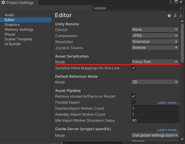 Project Settings - Editor - Asset Serialization 설정에서 Serialization이후 저장을 어떻게 할 것인지 (Binary, Force Text, Mixed) 지정할 수 있다.