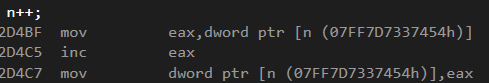 VS에서 n++ 코드에 중단점을 걸고 디버깅실행을 한 후, 디스 어셈블리를 확인하면 n++코드가 정확히 어떻게 돌아가는지 알 수 있다.