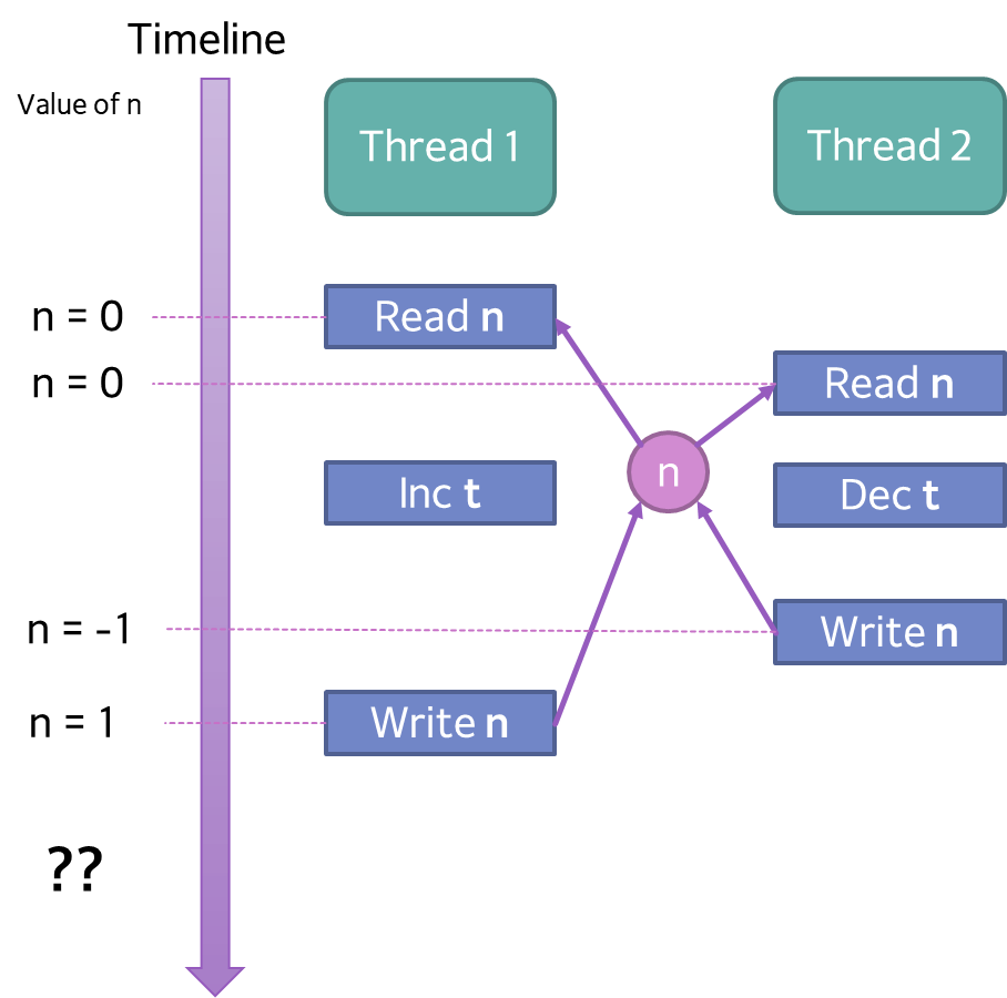 A 쓰레드에서는 1을 더하기 전에는 n값이 0 이었고, B쓰레드에서도 1을 빼기 전에 읽은 n값이 0이라고 한다면, 최종적으로 n값은 -1이 될 것이다. (A쓰레드에서는 n에 1을 저장하지만, B쓰레드에서도 n에 -1을 저장할 것이다.)